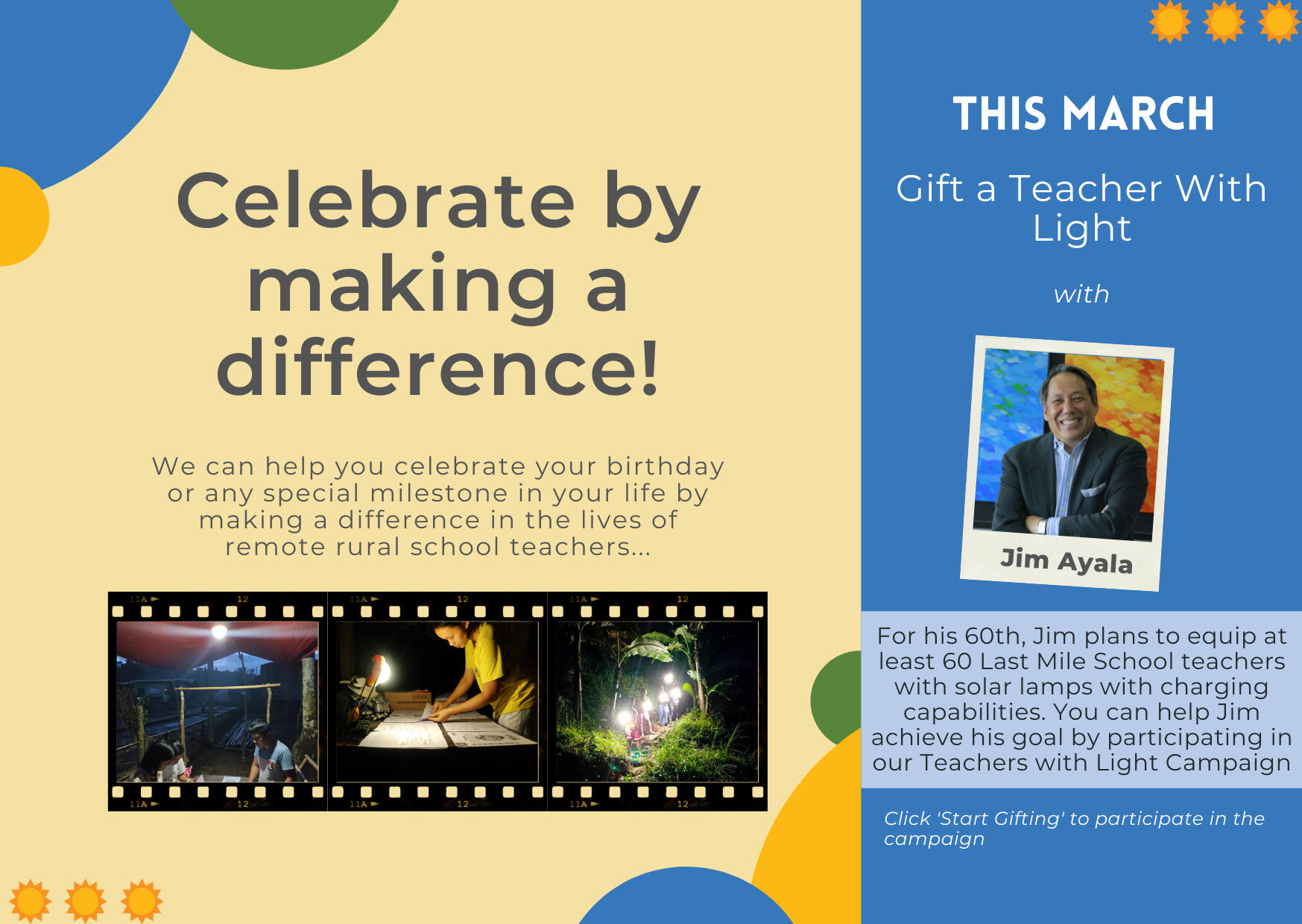 Through our Teachers With Light program, we aim to provide portable solar lanterns to 1,000 teachers that will ensure no Filipino child is left behind as they deliver door-to-door education in areas limited by darkness.